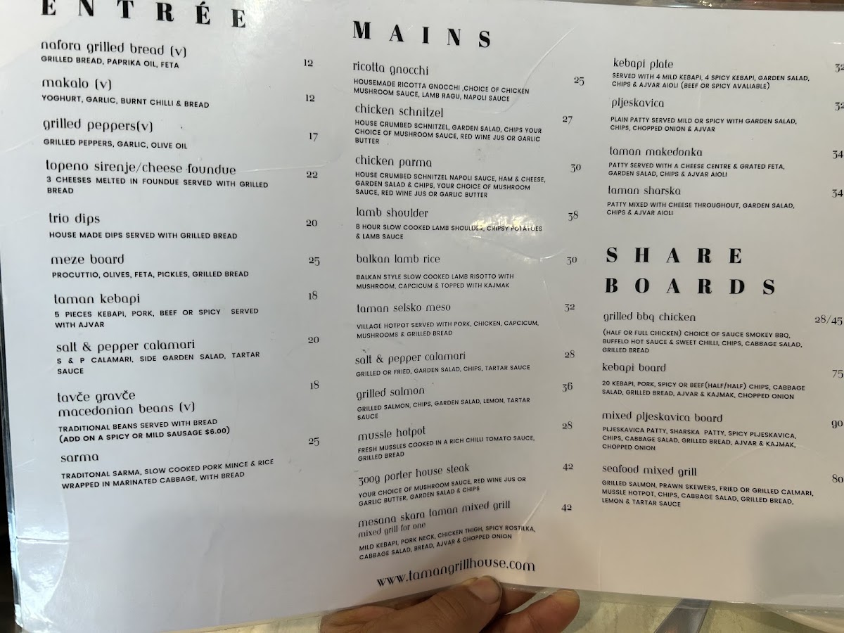 From a reviewer’s perspective, the menu at Taman Macedonian Grill House at 264 Taylors Rd, Delahey, offers a well-rounded and satisfying snapshot of Macedonian-inspired comfort food paired with familiar crowd-pleasers and premium drinks. The Mains section highlights hearty dishes such as Ricotta Gnocchi, Kebapi Plate, Pljeskavica, Chicken Schnitzel, and Chicken Parma, each reflecting a balance between traditional Balkan flavors and popular Australian pub-style classics. For groups, the Share Boards stand out as a strong point of the menu, with generous platters like Grilled BBQ Chicken, Kebapi Board, Mixed Pljeskavica Board, and Seafood Mixed Grill, all designed to be shared and enjoyed communally, reinforcing the restaurant’s warm and social dining atmosphere. The beverage selection is elevated by the Top Shelf range, featuring premium whiskies such as Johnnie Walker Blue Label, Johnnie Walker Gold Label 18 Years, Johnnie Walker Gold Label Reserve, and Johnnie Walker Double Black, which add a refined touch for guests looking to complement their meal with a high-quality drink. Rounding out the experience, the Others section provides excellent starters and sides including Nafora Grilled Bread, Makalo, Grilled Peppers, Topeno Sirenje / Cheese Fondue, and Trio Dips, perfect for easing into the meal or sharing alongside mains. Overall, the menu feels thoughtfully curated, offering variety without being overwhelming, and successfully bringing together traditional flavors, generous sharing options, and premium beverages into a cohesive and memorable dining experience.